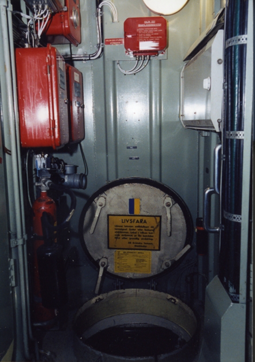 Nedgång till maskincentral sett från övre tambur, de röda skåpen till vänster i bild är utlösnng av kolsyra i maskinrum och maskincentral