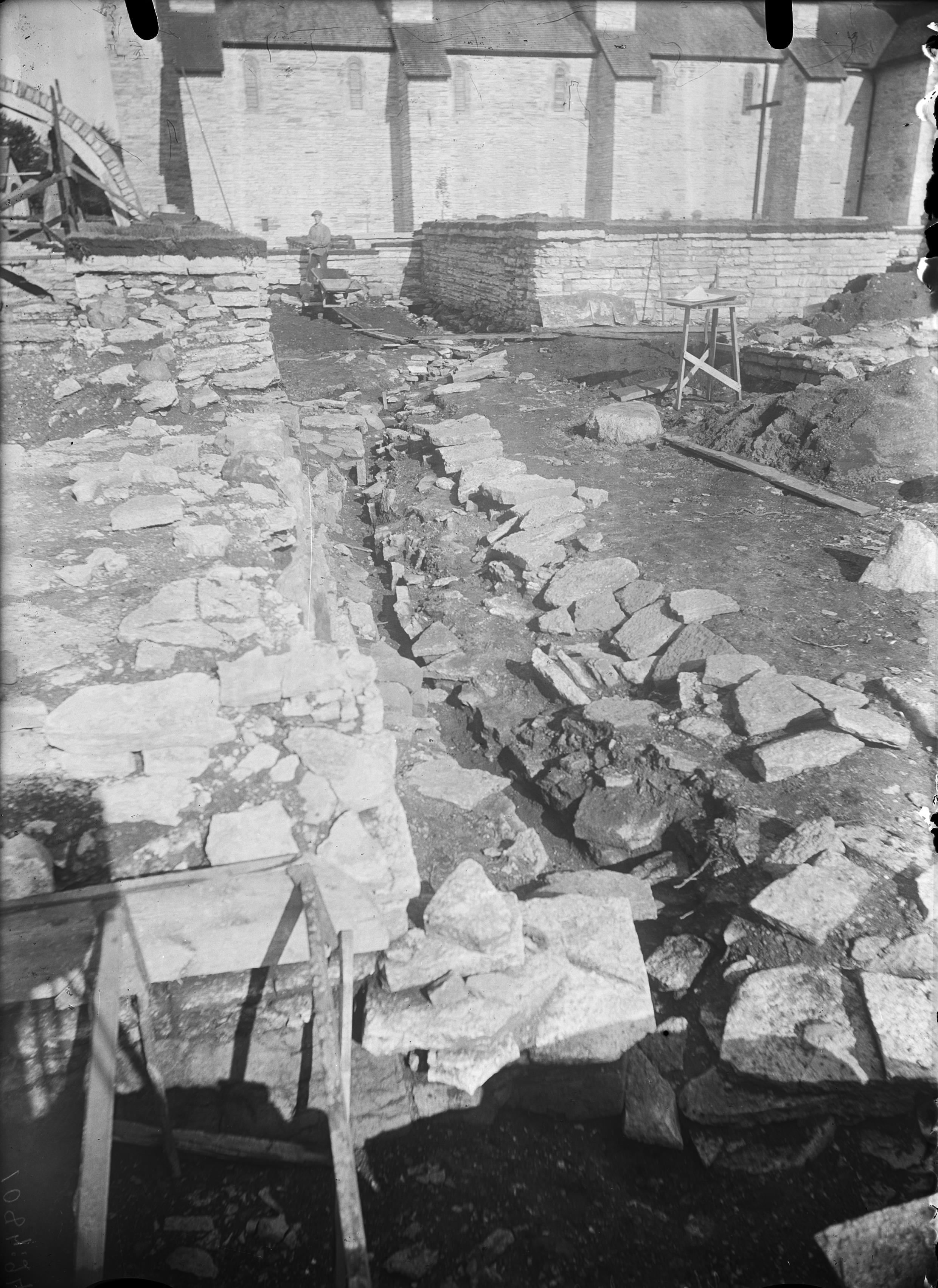 Kanalen genom områdets södra del med täckhällarna bortlyfta. Längst ned kanalens mynning ut i stora kanalen. Från söder.