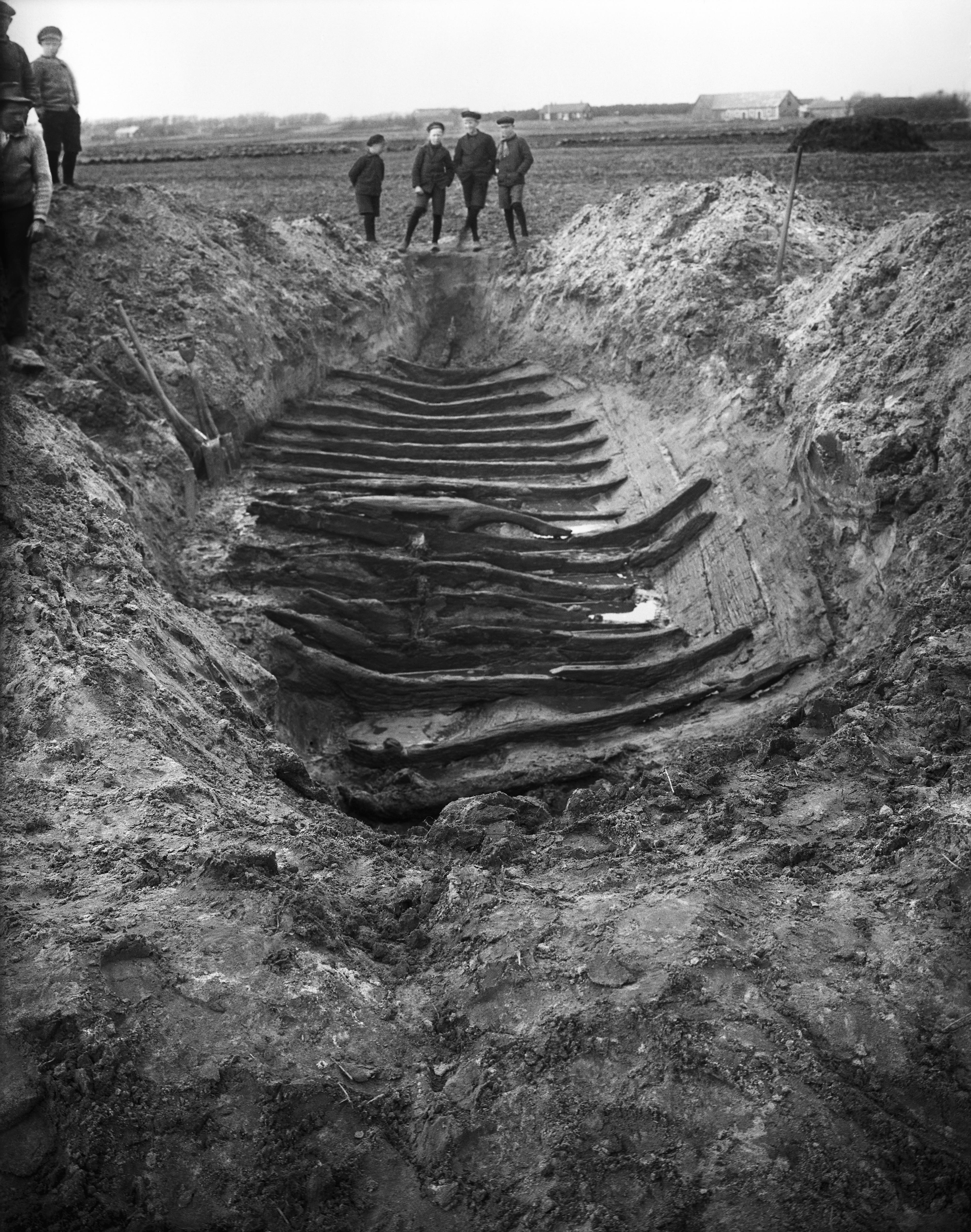 RAÄ-nummer Tvååker 4:1. Skeppsfynd i Galtabäck, före undersökningen 1928. Skeppet har daterats till 1100-tal.