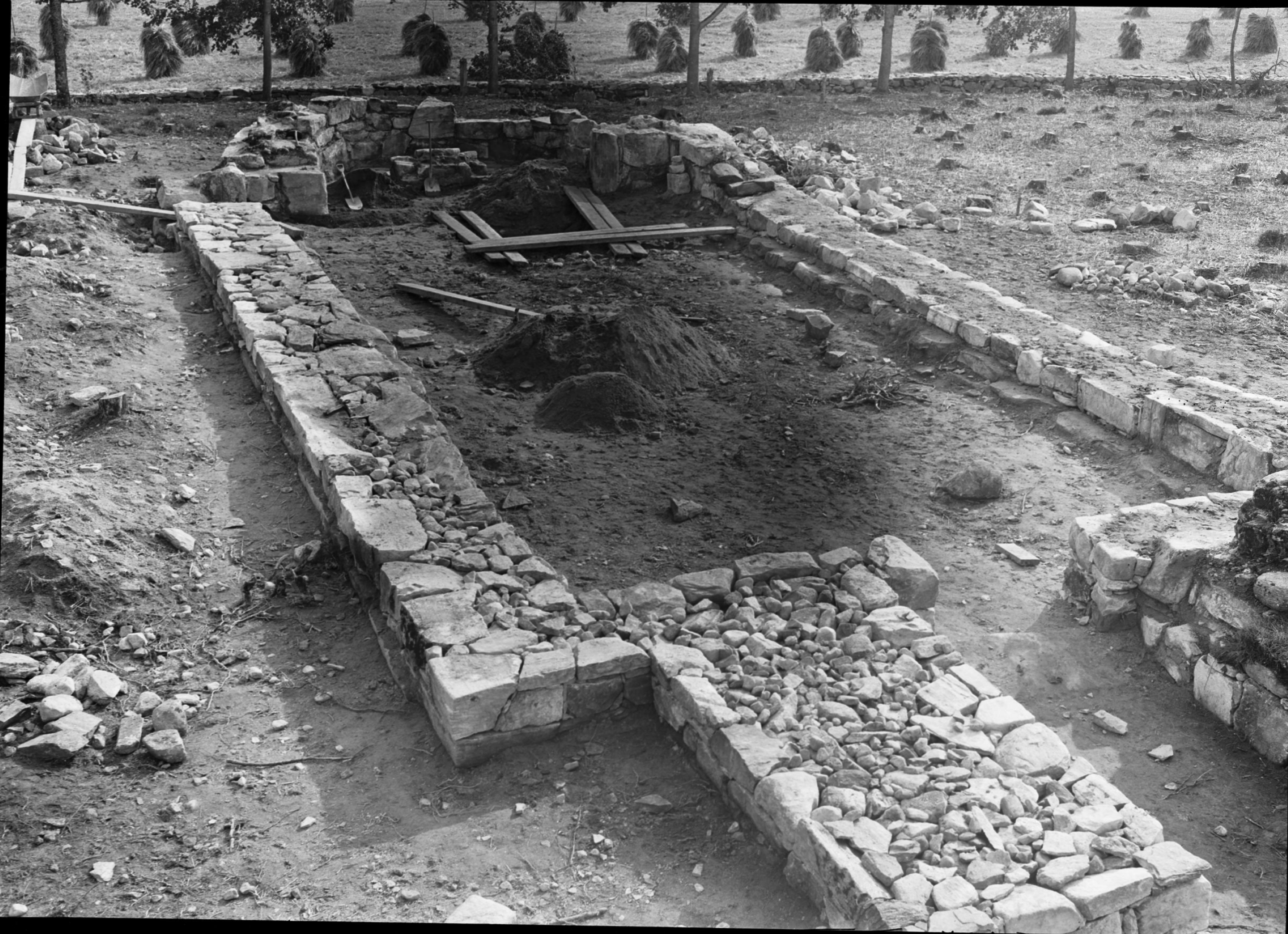 Kyrkoruinen från väster. Efter utgrävning. Plankorna i bakgrunden ligger kring ett öppnat gravkor.