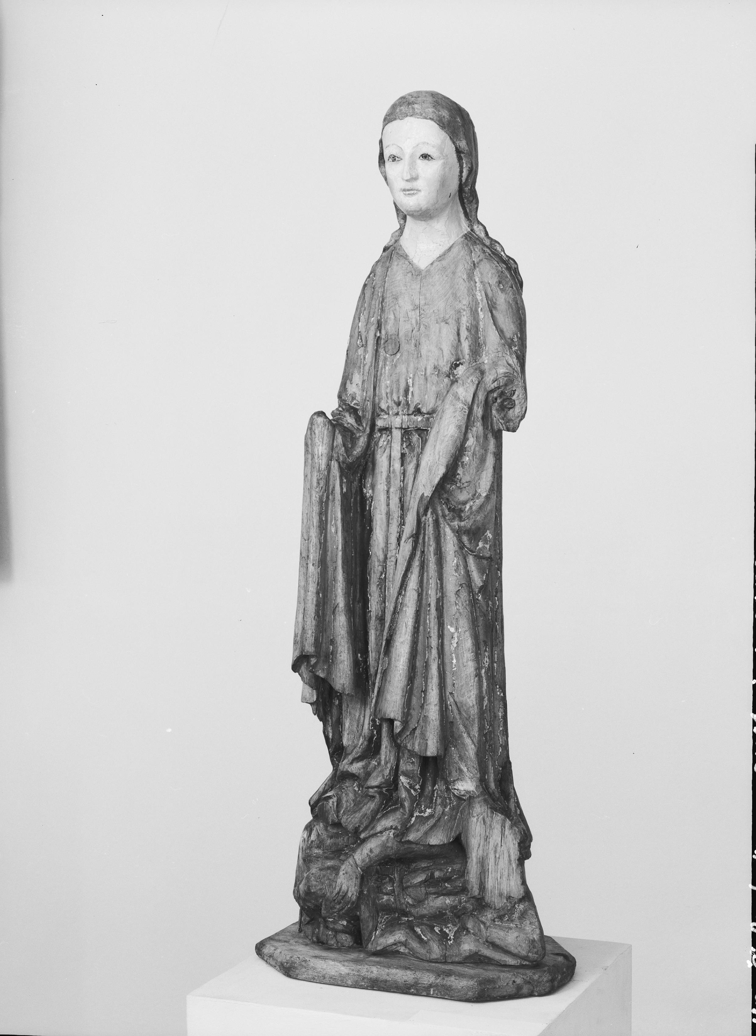 Skulptur, möjligen föreställande Sankta Margareta, trä, omkring 1300.