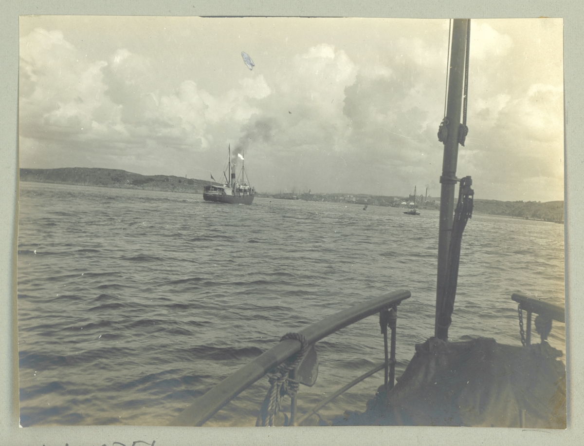 Bilden visar Göta älv som är livlig trafikerad av ångfartyg.