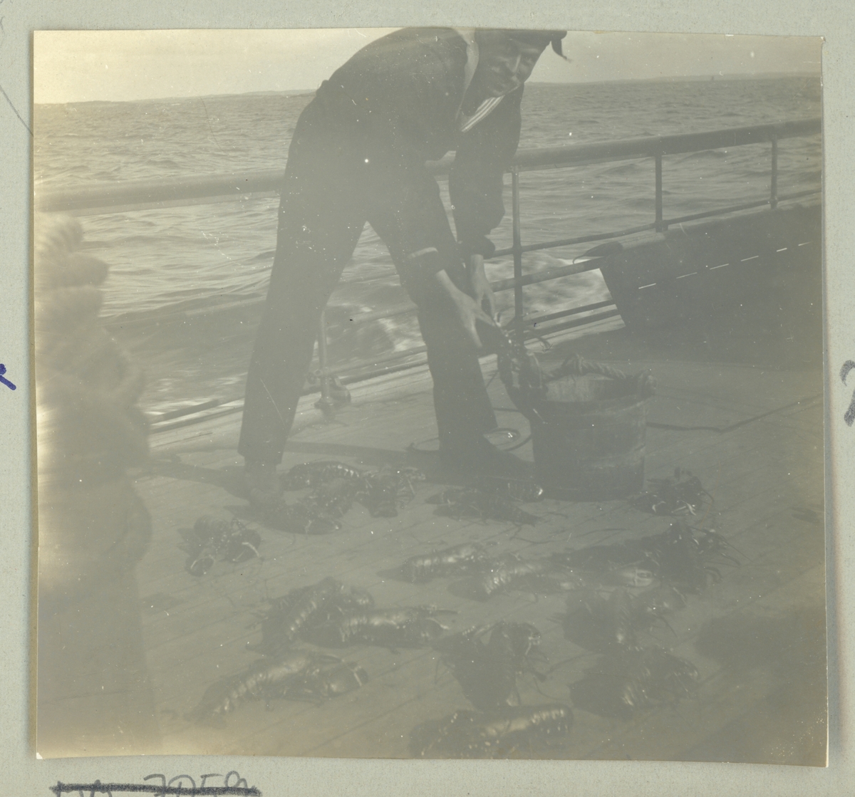Bilden visar en sjöman lägger hummer i en hink på däck.