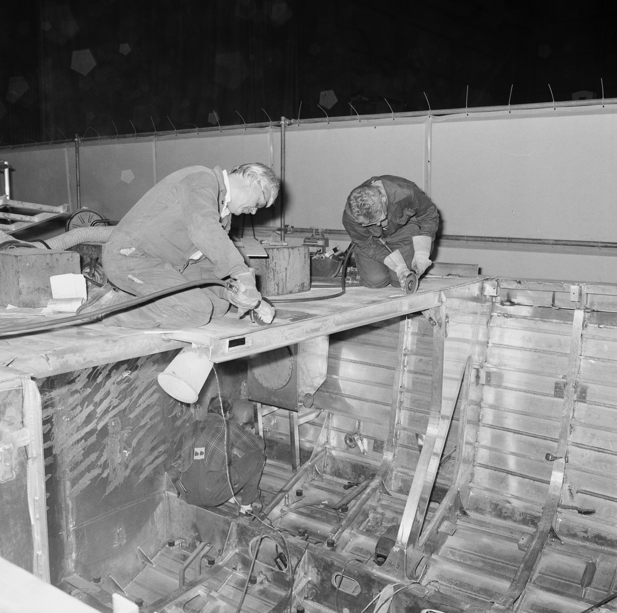 Lyft av förliga däcket till KBV 301 i flakhallen.