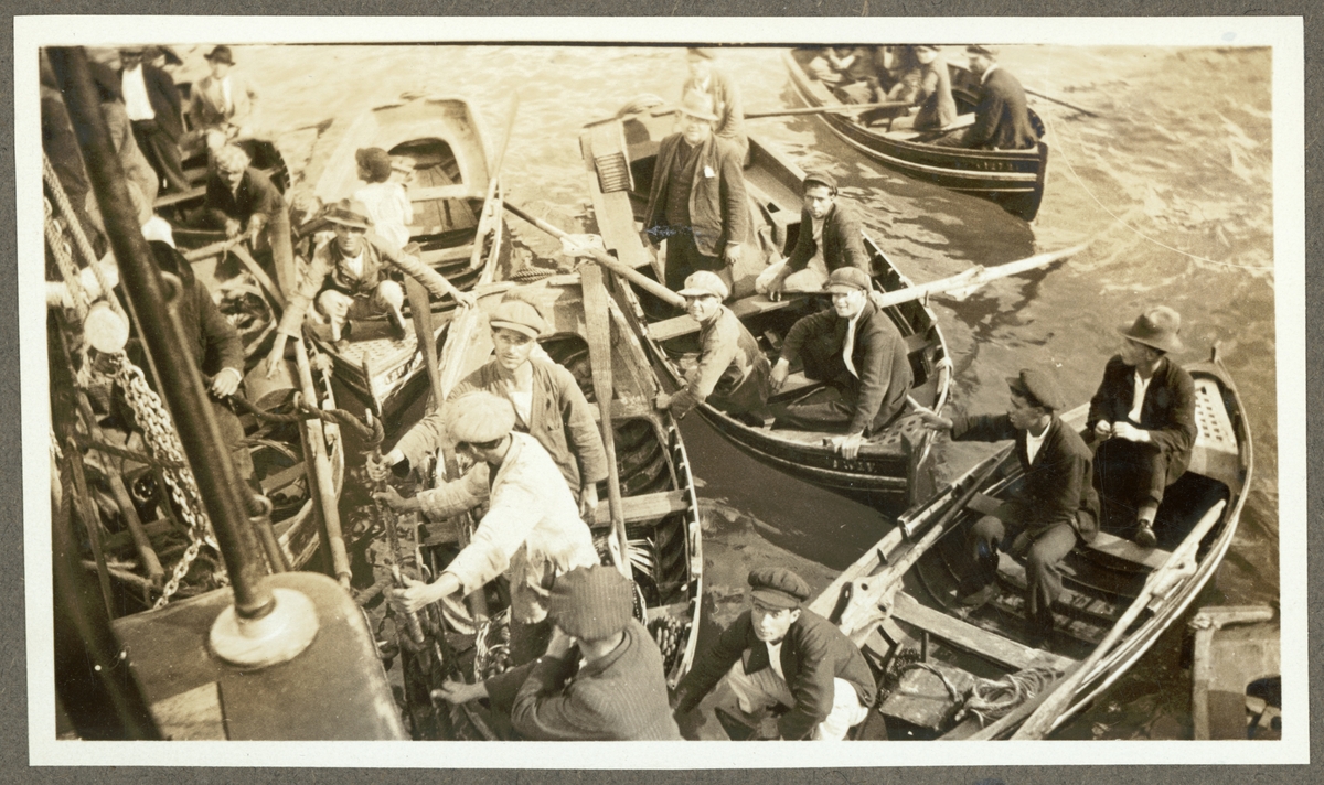 Bilden visar ett flertal handlare i småbåtar som levererar varor till Fylgia under besöket i Funchal.