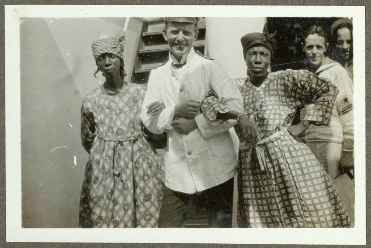 Bilden visar sjömannen Hamilton flankerad av två svarta kvinnor.