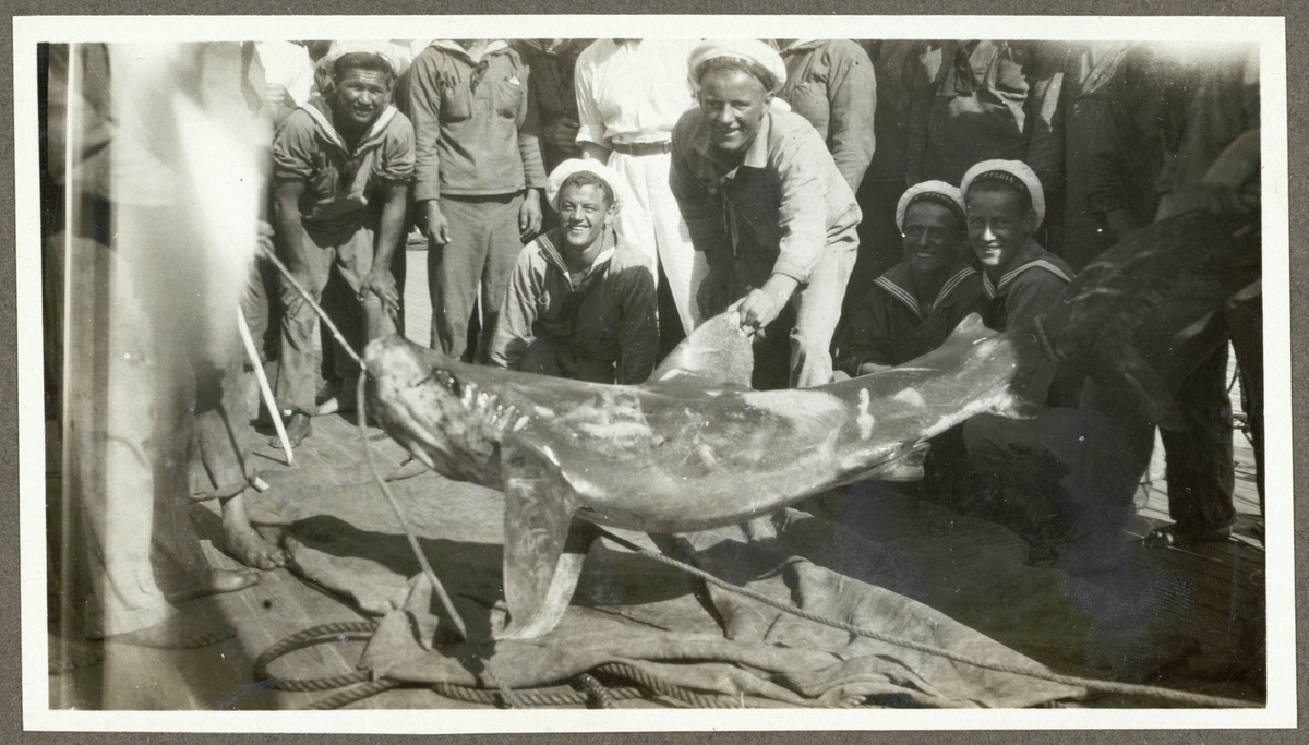 Bilden visar sjömän ombord på Fylgia som låter sig fotografera med hajen som har fångats.