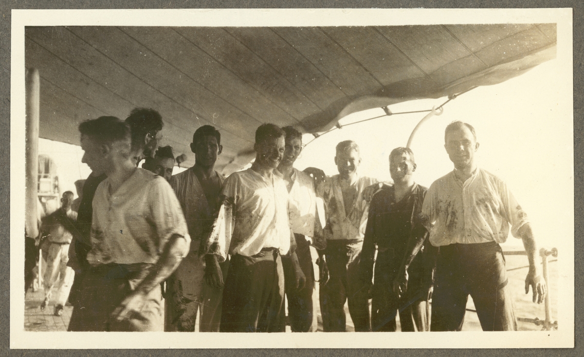 Bilden visar en grupp sjömän i smutsiga kläder ombord på Fylgia som trots besväret verka vara på gott humör.