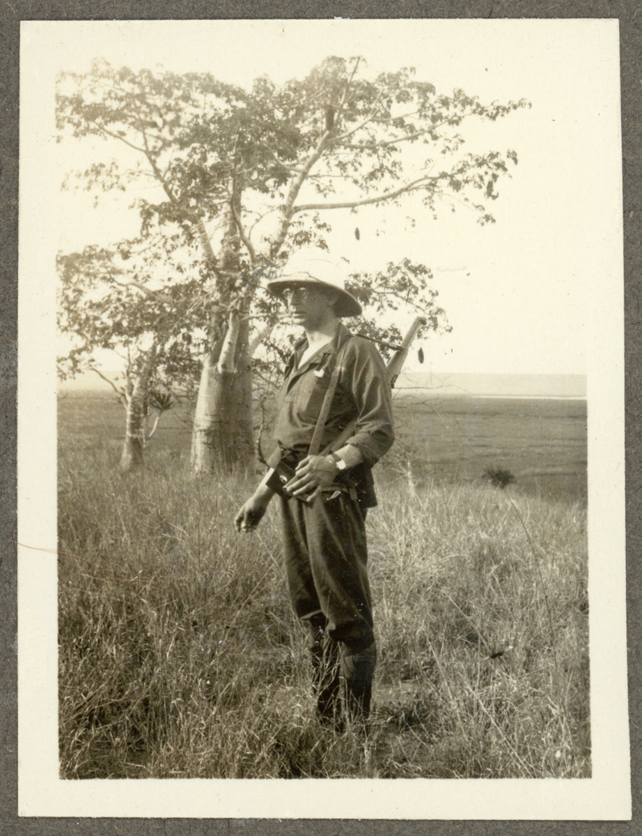 Bilden visar en person med tropikhjälm och jaktvapen i en afrikansk landskap.