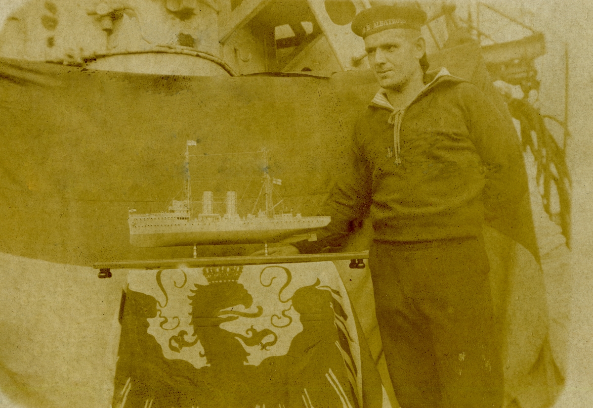 Sjöman bredvid en modell av Albatross.