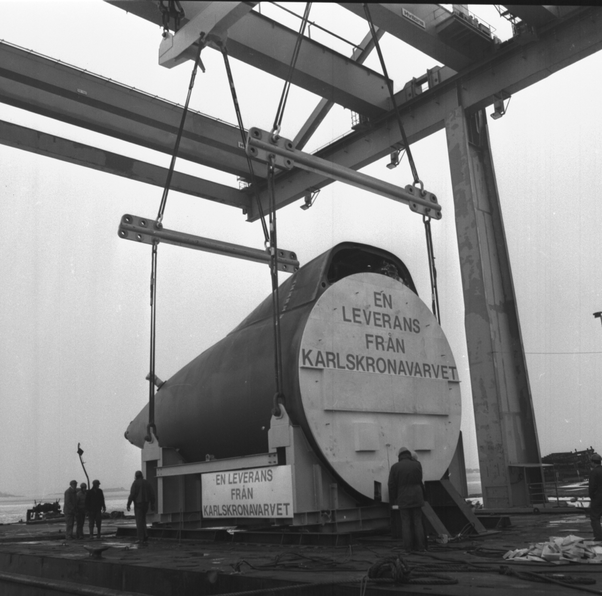:: Lyft av ubåtssektion typ Västergötland, för transport till Malmö\\\\anm. neg ingår i en serie om 10 st där endast det första \\V 103120 scannats/gp