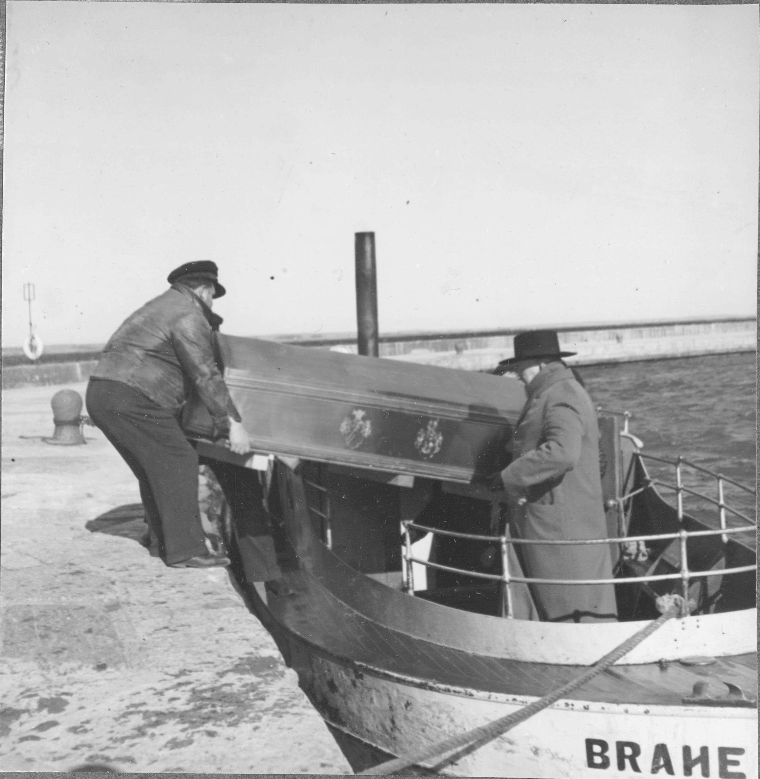 Margareta Brahe-Sparres kista. Kistan överflyttas till båten.