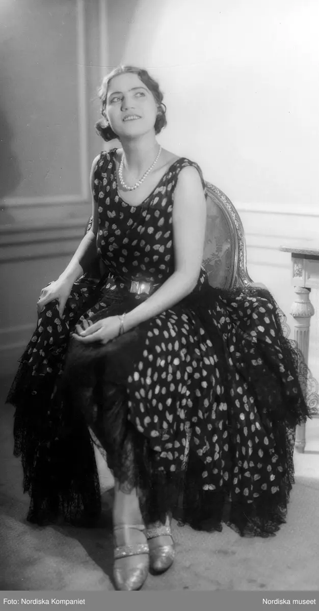 Modell i mönstrad klänning med spetskant och pärlhalsband, sitter på en stol.