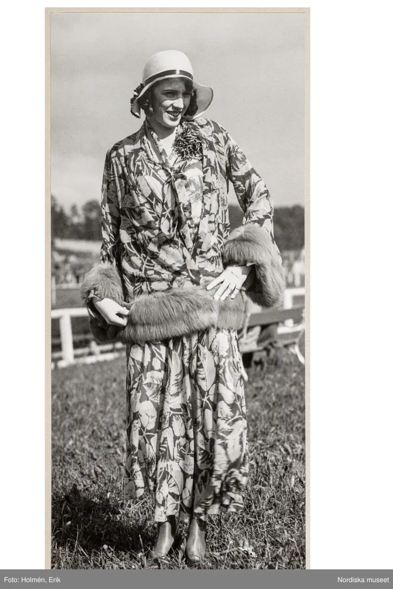 Mannekäng visar mode vid Ulriksdals galoppbana utanför Stockholm. Dräkt av mönstrat tyg, ankellång kjol med vidd. Höftlång jacka med pälskant nedtill och vid ärmsluten. Hatt. NK:s Franska damskrädderi.