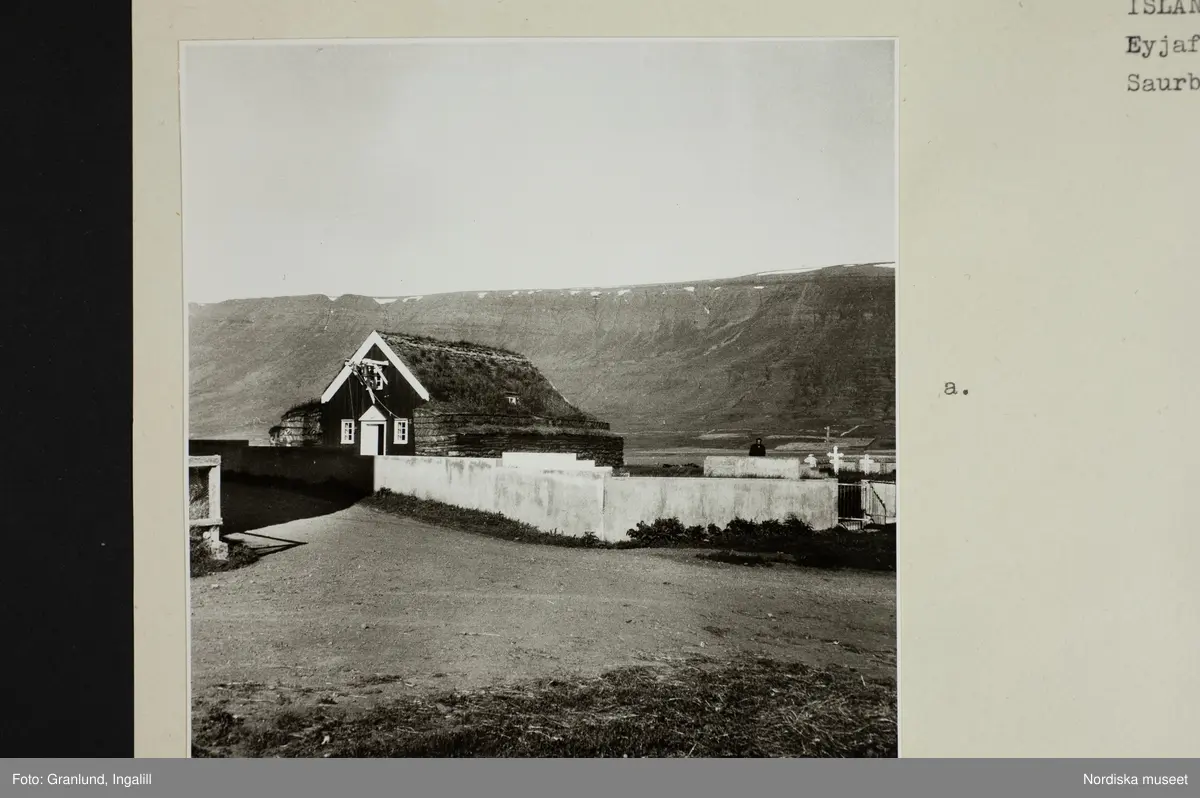 Detalj av ark med tre monterade foton: "a. Kyrkan sedd snett framifrån. Kyrkans bredd med torven är 9 á 10 m."