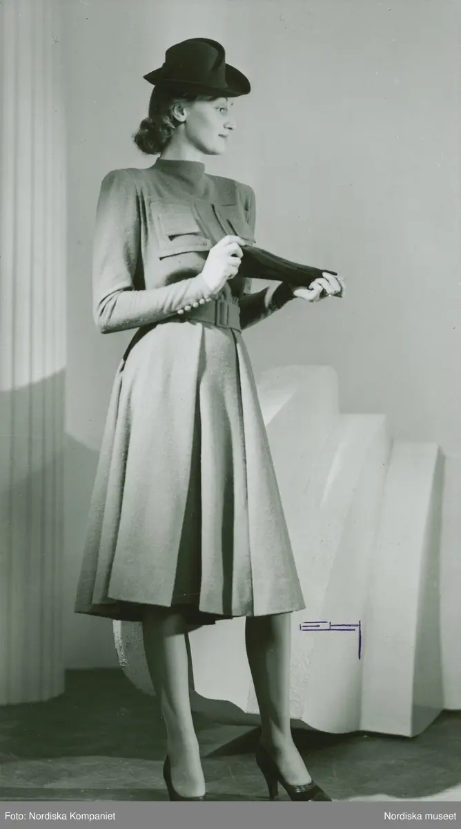 Modell i klänning med skärp, klädda knappar och fickor på bröstet, samt hatt, handskar i handen och pumps. Vit rekvisita i bakgrunden.