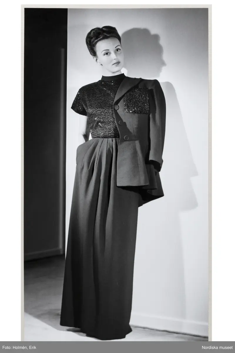 Mannekäng, möjligen Hjördis Grundel-Starenius, visar festklänning. Kortärmad överdel med liten ståkrage, dekorerad med paljetter. Hellång kjol med små veck från linningen. Över axeln en figursydd lång kavaj med paljettdekorerad bröstficka. NK:s Franska damskrädderi, original från Cristóbal Balenciaga.