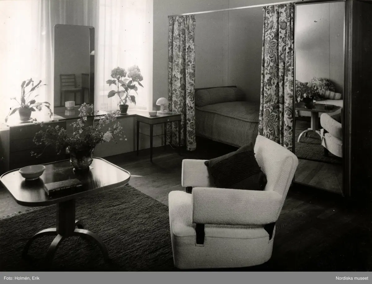 Arkitekten Axel Einar Hjorths utställning 1937, för varuhuset Nordiska Kompaniet i Stockholm. Sovrumsinteriör med möbler. Säng med blommiga förhängen och helfigursspegel, litet sängbord och framför de båda fönstren ett toalettbord med spegel. I rummets mitt en stoppad fåtölj och litet pelarbord. I fönstren växter, bland annat en blommande Hortensia.