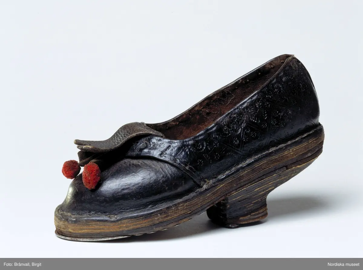 Damsko från Djura socken, Dalarna. Inv nr 149418. Klacken är placerad under hålfoten vilket var vanligt under en period fram till 1800-talets mitt.