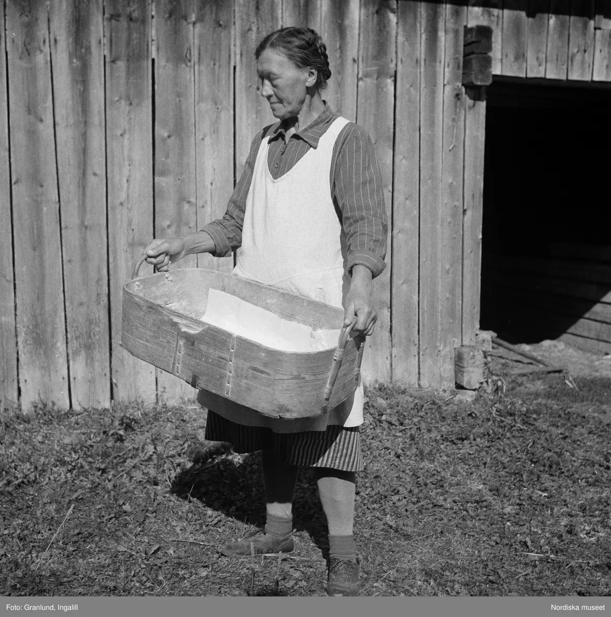 Osmundsbergs by i Boda socken, Dalarna. Röjås Hilda med såskäppa. Användes på vintern att bära in mjöl i.