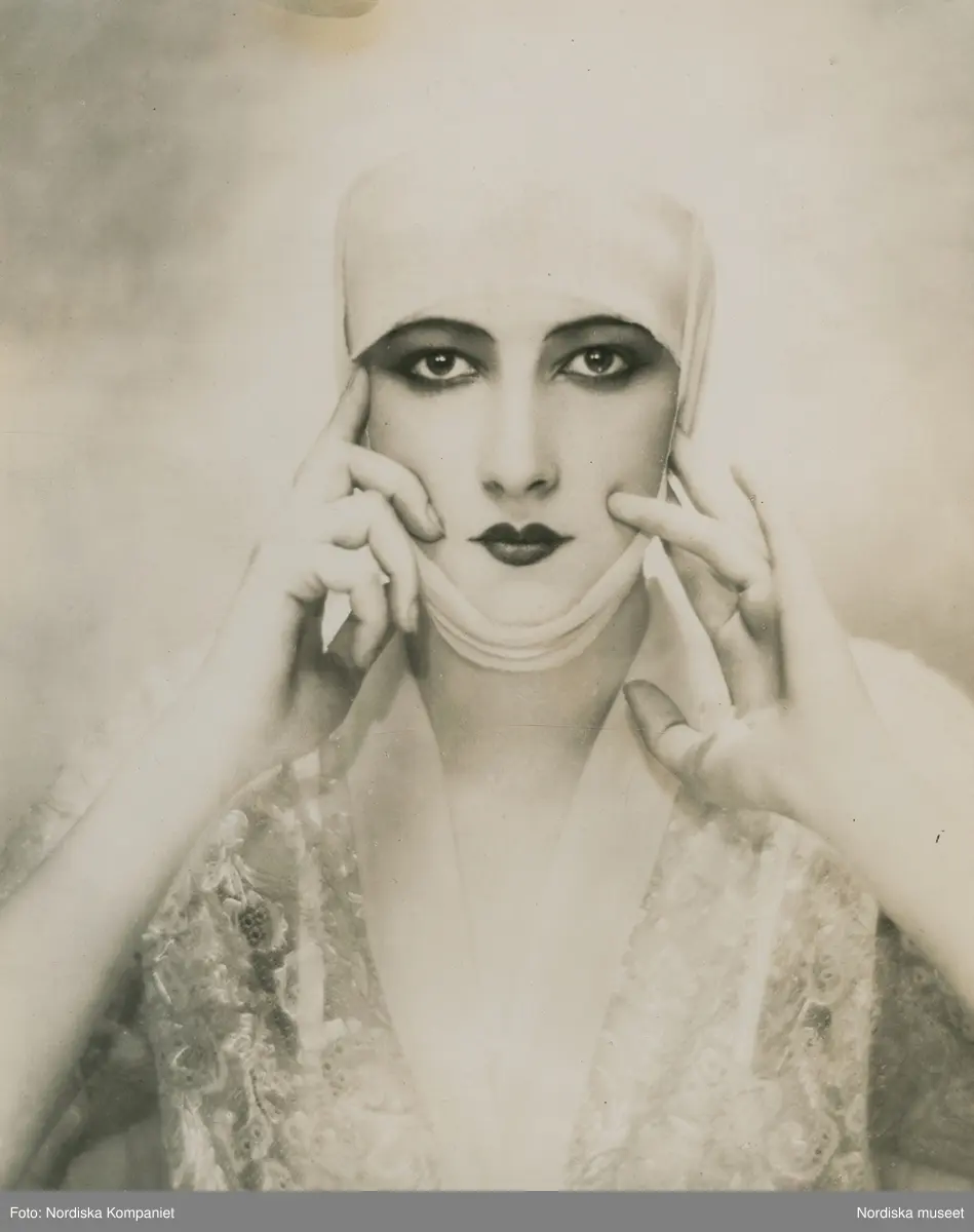 Porträtt av modell i make-up från Elisabeth Arden. "Elisabeth Arden-damen".