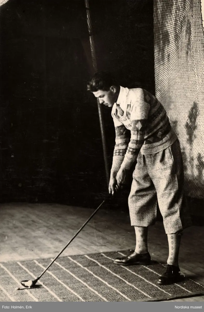 Golfutrustning NK (Nordiska Kompaniet) i Stockholm 1926. Manlig modell i golfkläder med golfklubba