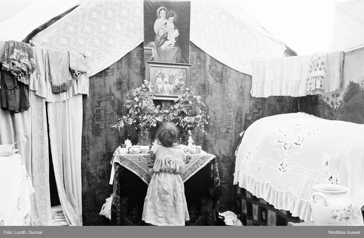 Interiör från familjen Taikons läger vid Johanneshov, södra Stockholm. Liten flicka ber vid familjens altare. Ovanför på väggen en bild av madonnan med barnet och ett familjefotografi.
