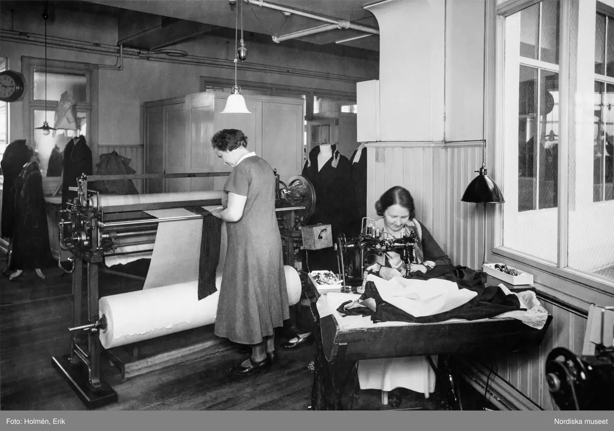 Interiör från NK:s Franska damskrädderi, syateljén vägg i vägg med visningssalogen, våningsplan fem. En sömmerska syr på en symaskin, en kvinna i manglar eller pressar tillklippt tyg i en maskin. I bakgrunden står provdockor klädda i olika plagg.