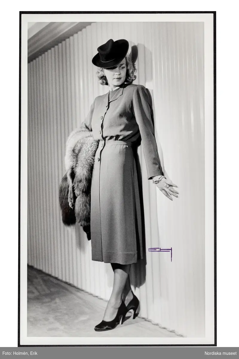NK:s Franska Damskrädderi. Mannekäng står iklädd kappklänning, pumps och hatt. Över ena armen en pälsboa. Armband med stora orgelbundna länkar och ring med stor sten. Design Gaby Jouval.