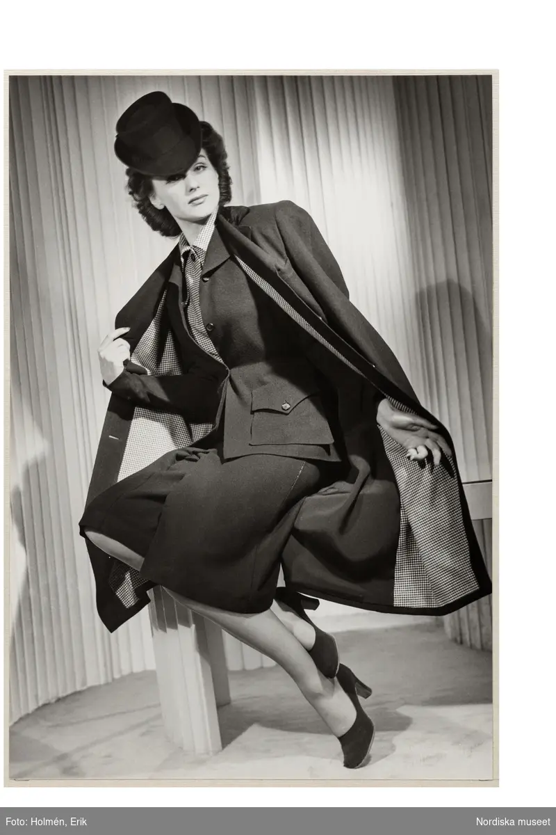 Mannekängen Hjördis Genberg poserar iklädd dräkt med kavaj med stora utanpåfickor och kjol. Över axlarna en kappa draperad, hatt med svängda brätten. NK:s Franska damskrädderi.