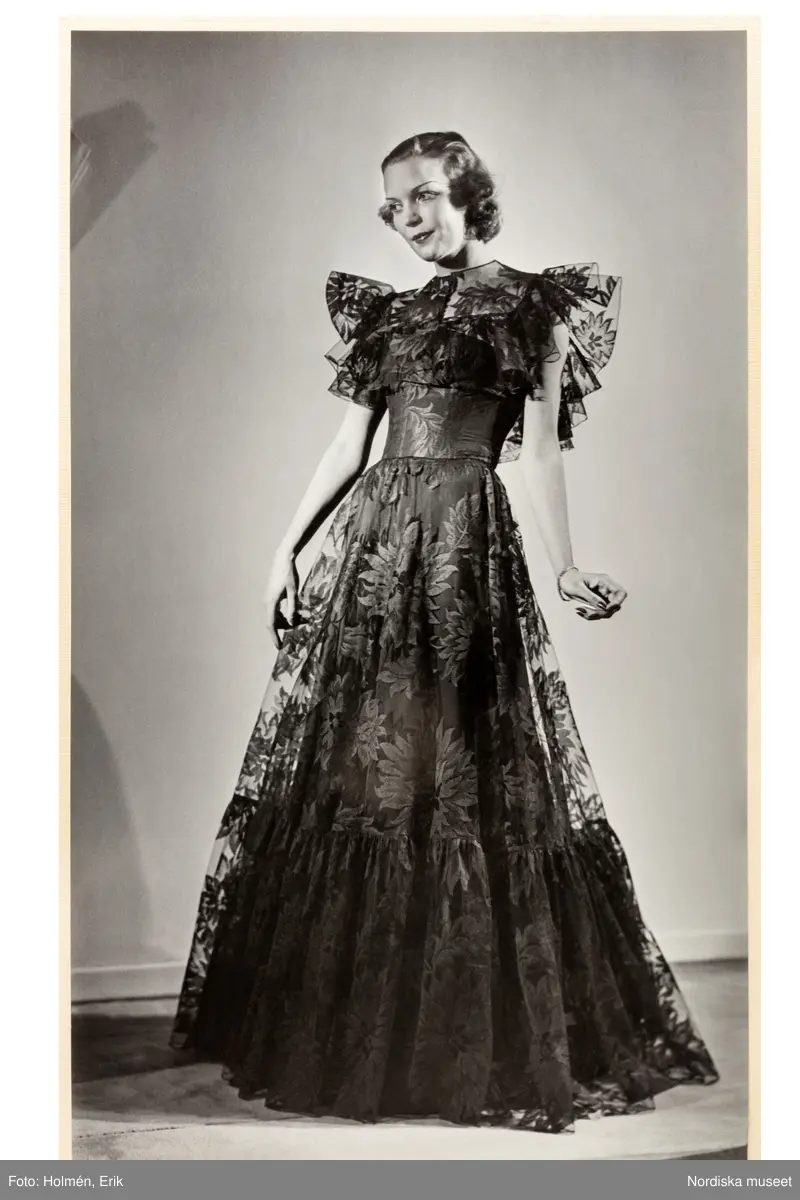 Mannekängen Margit Langlet visar festplagg i provrum. Klänning med åtsittande liv och hellång, vid kjol av mönstrat tyg. Stor volangkrage och kjolens övre lager av transparent bladmönstrad tyll. NK:s Franska damskrädderi.