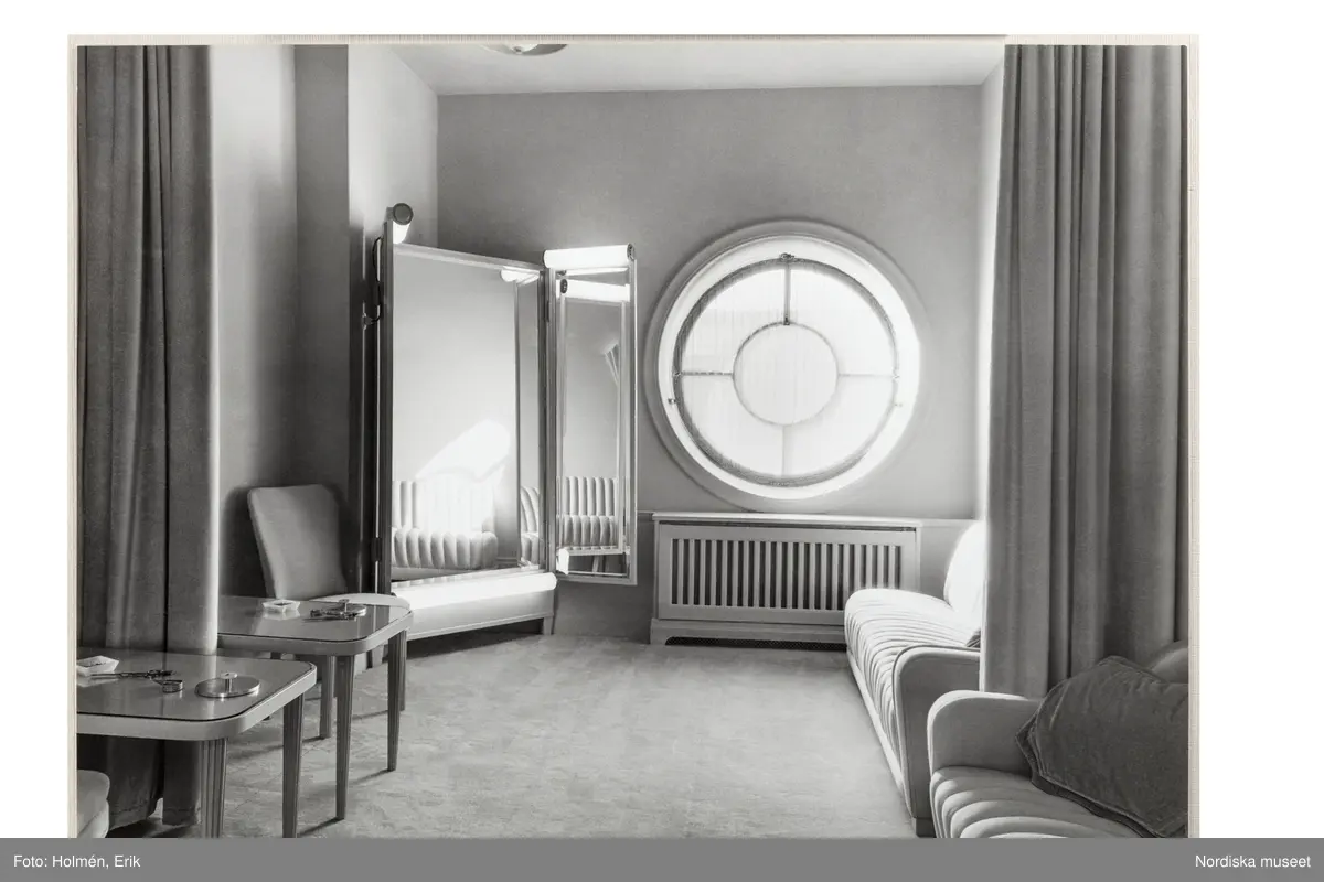 Interiör från Franska avdelningen på varuhuset NK, Nordiska Kompaniet, i Stockholm. Utmed väggarna i rummet står stoppade soffor och nätta bord. Höga speglar med lysrörsbelysning. Heltäckningsmatta. Ett cirkelrunt fönster med spröjsar. Salongen på plan fem uppdaterades 1939 i luxuös stil med klassicistiska inslag signerad NK:s stilbildande inredningsarkitekt Svend A Thoresen. Den pärlgrå signaturkulören som introducerades 1926 omsluter nu hela rummet.