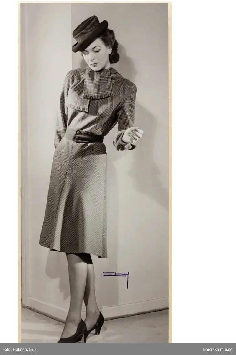 Mannekäng, troligen Hjördis Genberg, poserar iklädd knälång, glencheckrutig klänning med lång ärm. Draperad krage/scarf och brett skärp, hatt med rutigt band. NK:s Franska damskrädderi.
