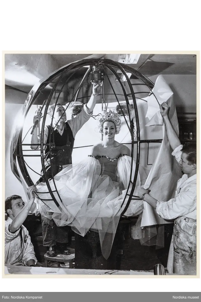 Operamaskeraden. Kvinna utklädd med peruk av kulor och dräkt med ärmar av tyll sitter i metallkonstruktion, delvis inklädd i skyddspapper. Tre män i vita rockar assisterar henne. En av dem monterar en lampa i metallburens tak.