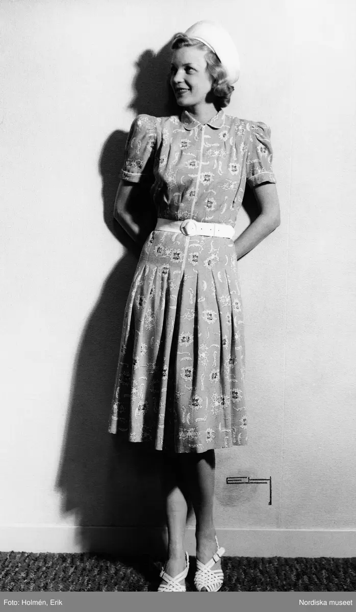 Modell i mönstrad klänning, vita sandaletter och vit pillerburkshatt.