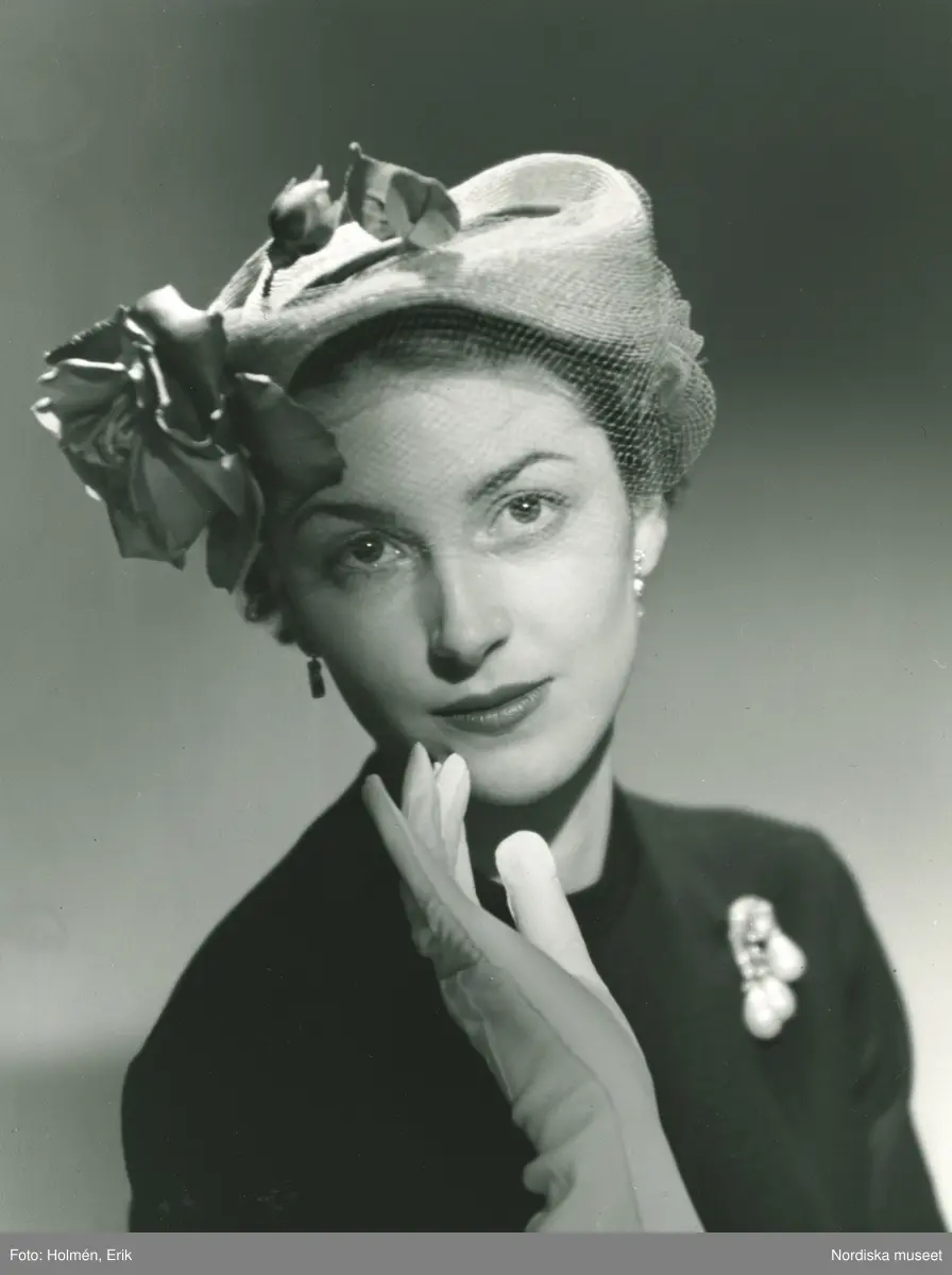 Porträtt av kvinna i guldbrun stråhatt med blomma i samma färg, av Maud Roser.