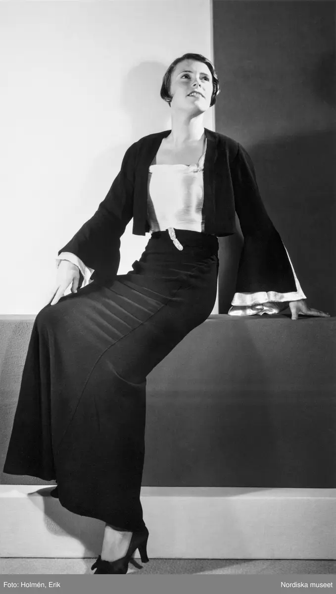 Mannekäng visar festkreation. Ljust åtsittande liv samt liten, kort jacka i mörkare färg med vida tvåfärgade ärmar samt hellång kjol sydd på skrådd. Glittrande spänne vid midjan. Pumps med rosett. NK:s Franska damskrädderi.