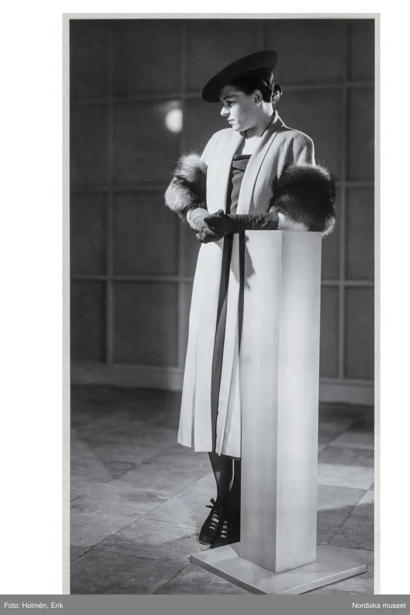 Mannekäng visar ytterplagg. Vadlång kappa med smala, långa slag och veckad nederdel. Trekvartslång ärm med pälskant. Hatt, långa handskar och skor med snörning. NK:s Franska damskrädderi.