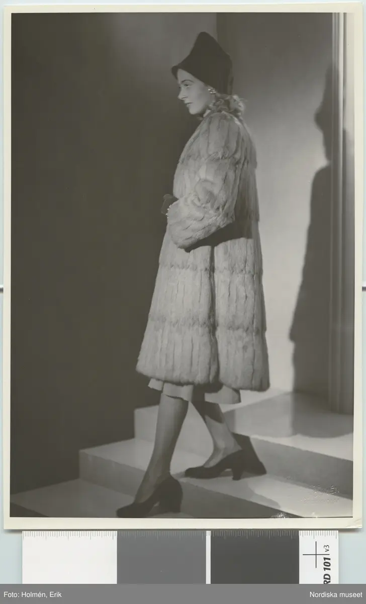 Nordiska Kompaniet. Kvinna i ljus päls och svart hatt. Text på baksidan: "Arkivbild d. 21/8 45"