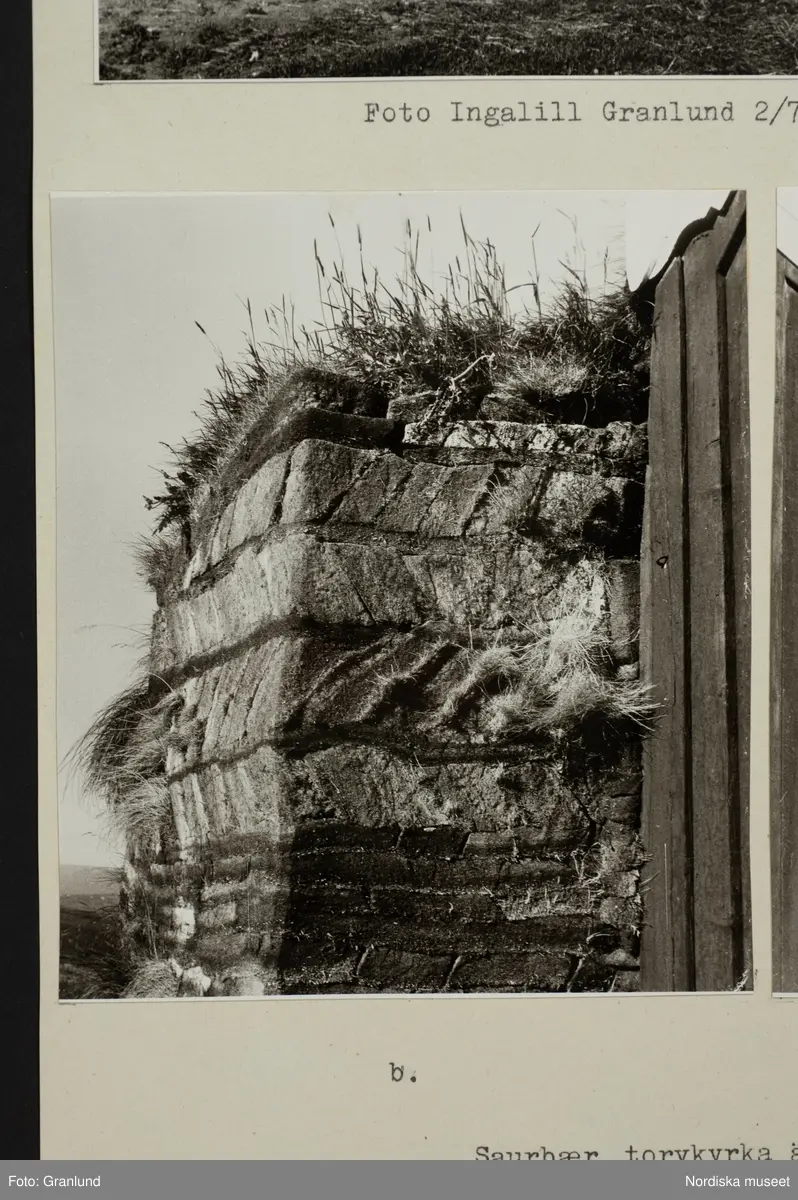 Detalj av ark med tre monterade foton: "b. visar torvväggen till vänster om ingångsdörren"