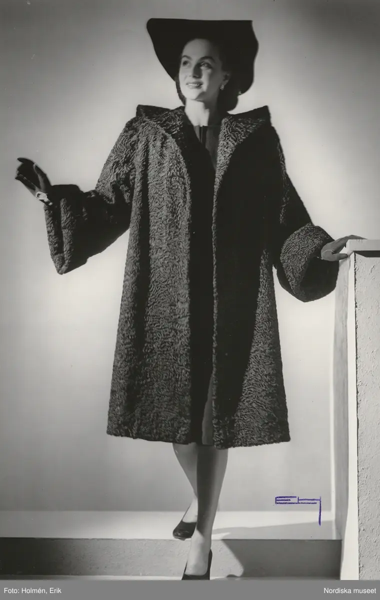 Nordiska Kompaniet. Kvinna i persianpäls och svart hatt.
