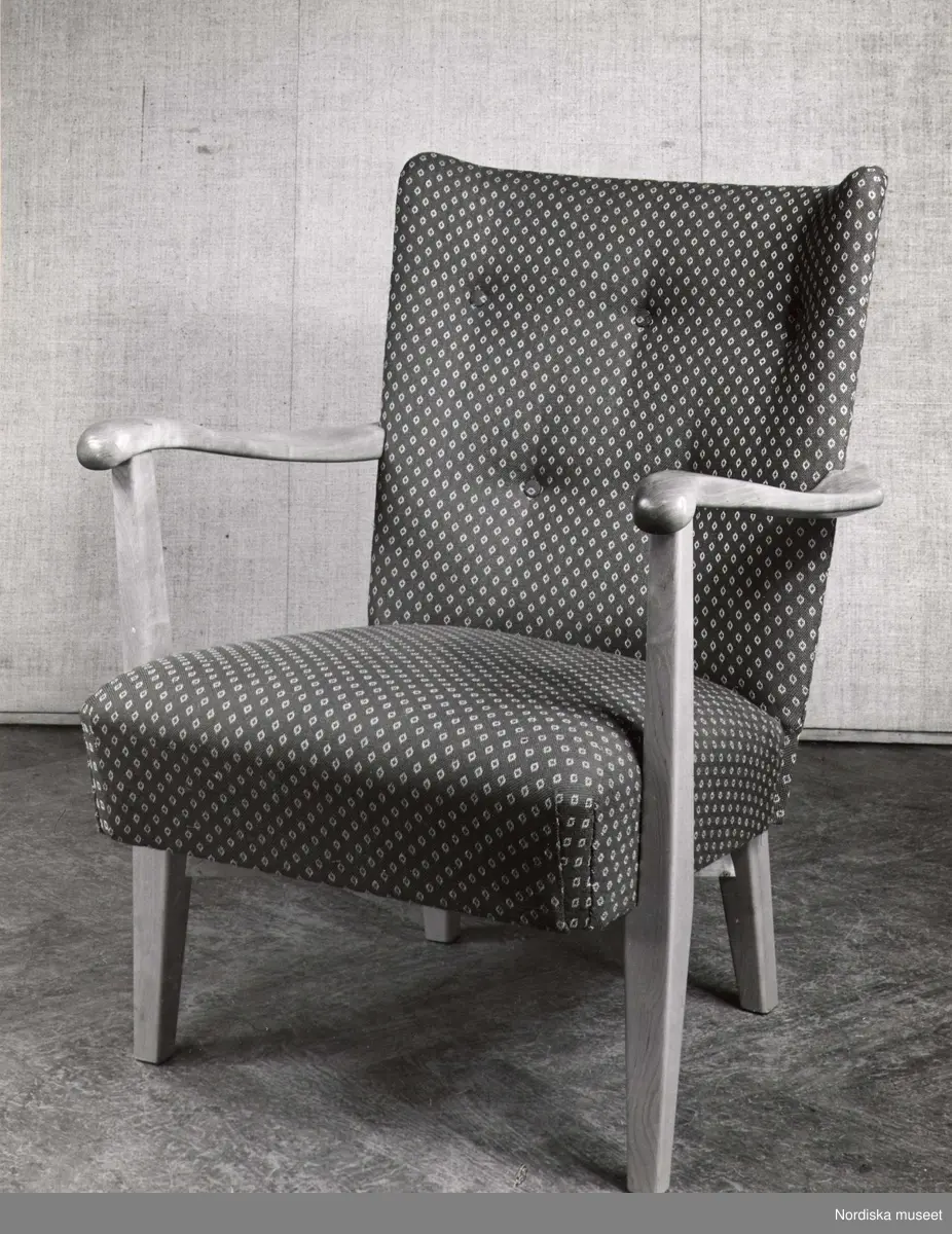 Stoppad Triva Byggfåtölj med armlän och ben av trä, på varuhuset Nordiska Kompaniet 1945. Serien Triva Bygg var Sveriges första monteringsbara möbler som levererades i platt paket, komplett med skruvar och beslag.