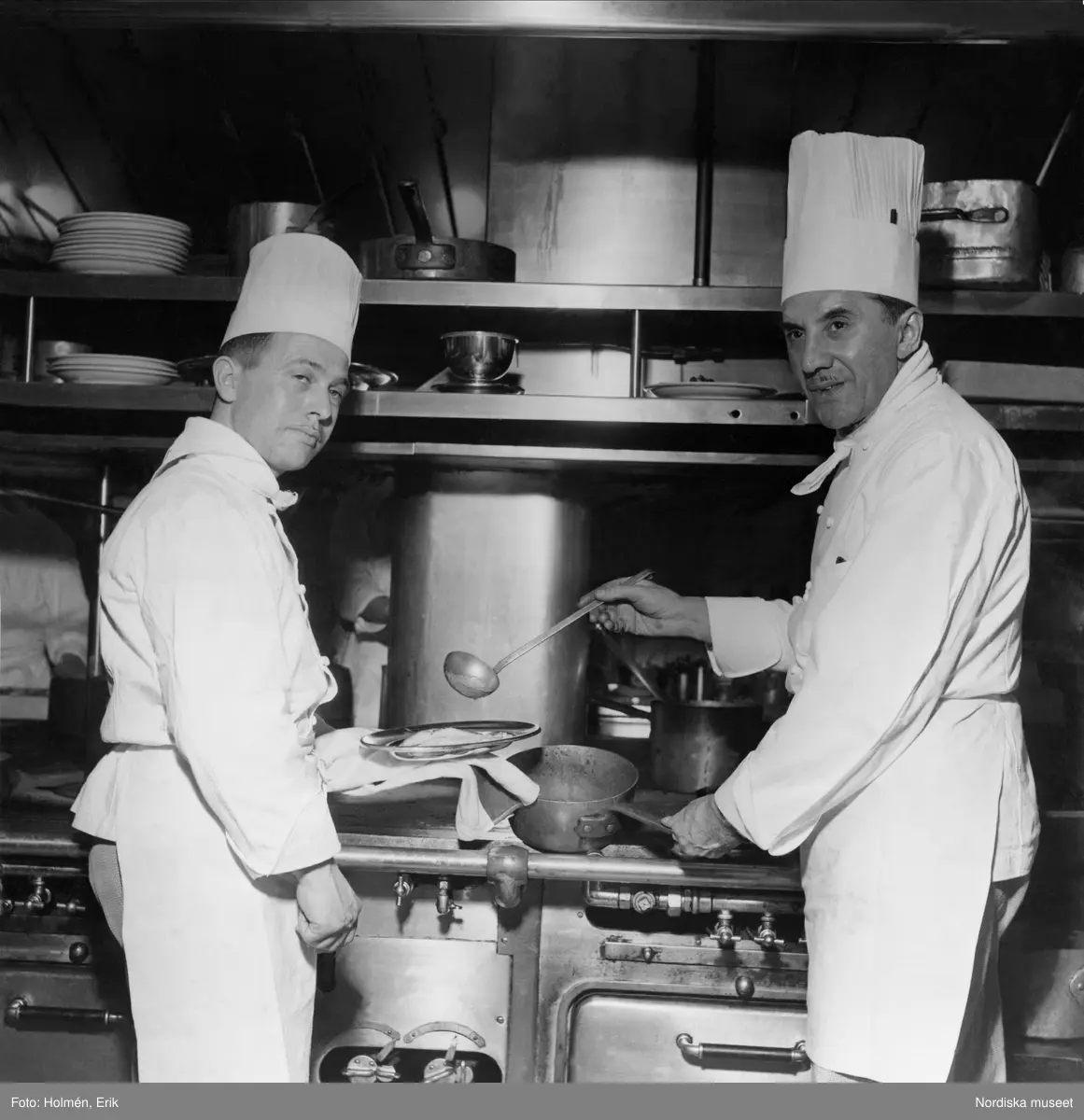 Fransk festival 1955. Två kockar lagar fransk mat. Nordiska Kompaniet.