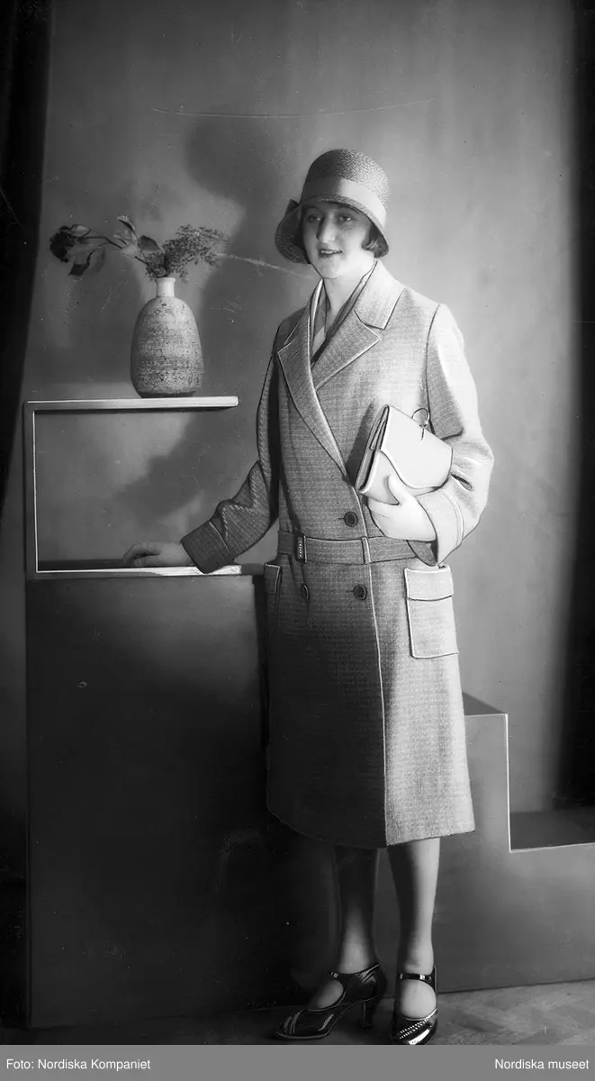 Modell i kappa, klockhatt och kuvertväska, vid en ställning med blomvas.