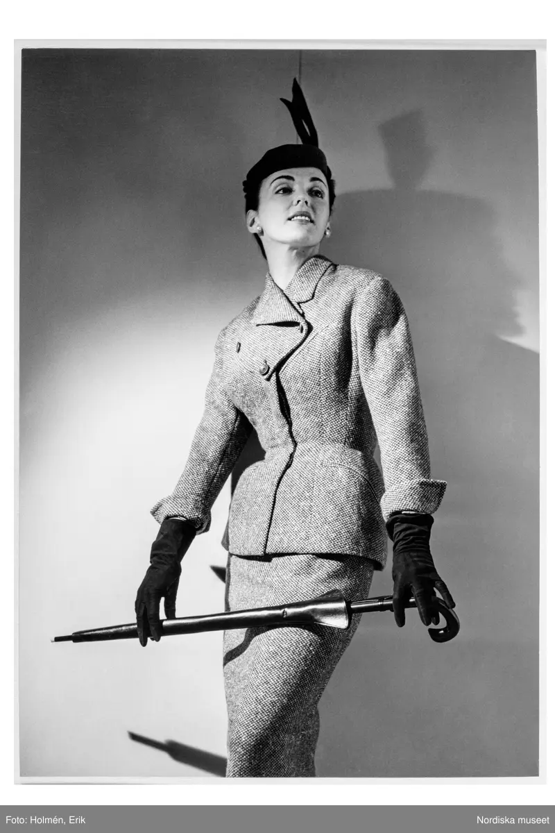 Mannekäng visar dräkt i provrummet vid NK:s Franska damskrädderi. Figursydd jacka av ylle, möjligen tweed, stusslång med omlottknäppning vid bysten. Något kort ärm med uppvikt manschett. Pennkjol. Hatt med långa fjädrar, handskar och paraply i händerna.