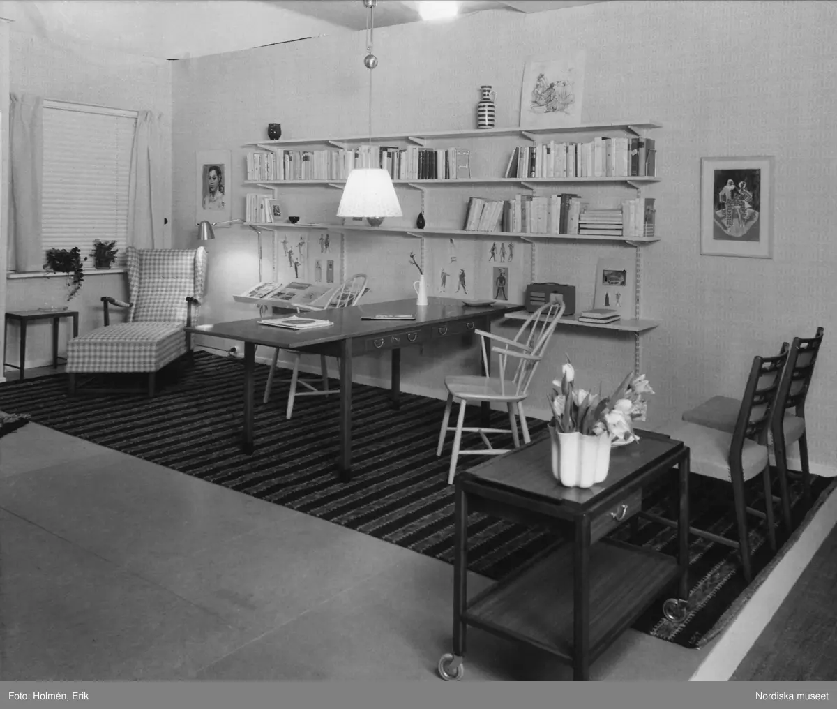 Nordiska Kompaniet. "1 pristagarens vardagsrum (tvårumslägenhet). Brud i Hem 1950". Rumsutställning.