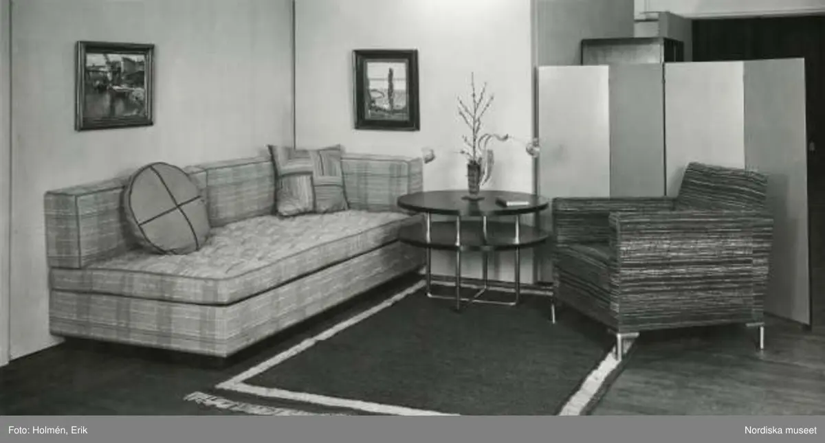 Utställningsinteriör med soffa och fåtölj samt runt bord med stålrörsben. Modell "Record".
