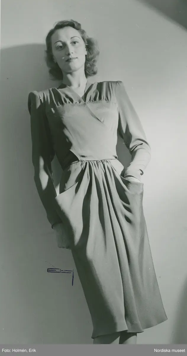 Porträtt av kvinna i klänning med fickor och draperade detaljer.