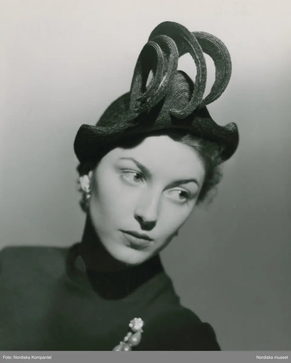 Porträtt av modell i stråhatt av Madame Paulette, samt brosch och örhängen.