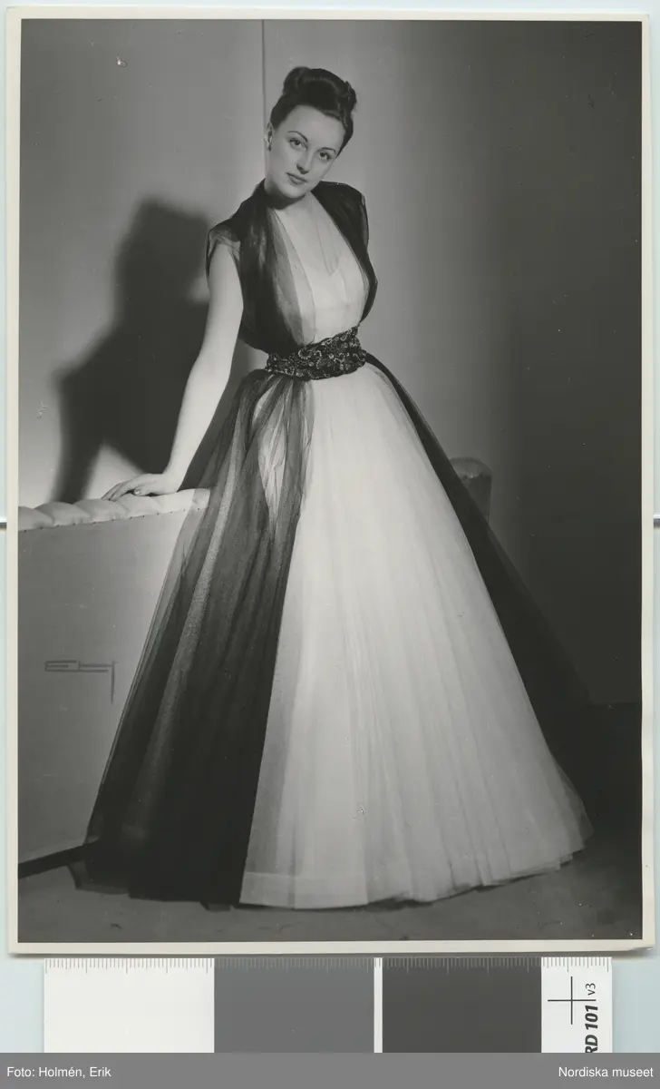 Nordiska Kompaniet. Mannekäng, möjligen Hjördis Grundel-Starenius, i aftonklänning av vit och svart tyll. I midjan ett brett skärp med broderi och pärlor. Text på baksidan: "NK uppvisning mars 1947"
